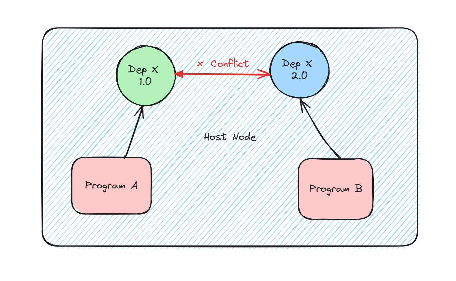 这仅仅是单个业务程序的依赖管理,我们还需要考虑多个业务程序同时在一台机器上混合部署的情况,在这种情况下,多个程序间的依赖还有可能产生冲突:比如程序A需要依赖X的1.0版本,程序B需要依赖X的2.0版本,而如果依赖X的1.0和2.0无法共存,那么这两个程序就无法部署到同一台机器上了,这种情况显然也是很棘手的。
