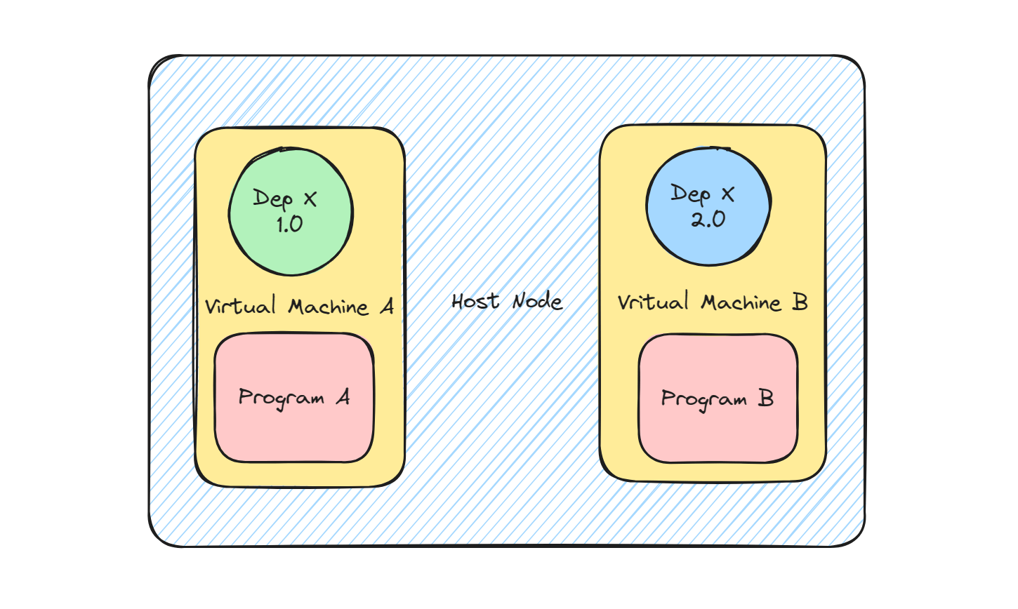最简单的实现方式就是每个版本的程序独占一台机器,这台机器上的依赖环境完全为这个版本的程序服务:要部署一个新版本程序,就必须先把机器重置然后安装此版本的程序所需要的依赖环境,这样程序自身版本前后的依赖冲突和多个程序间的依赖冲突问题不就都解决掉了?
